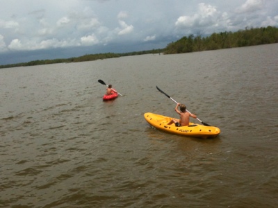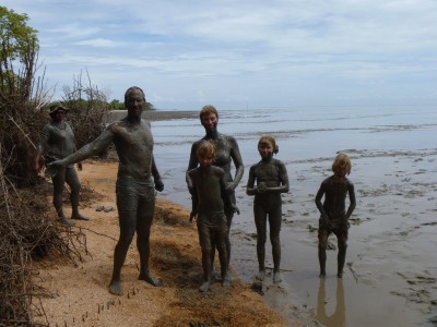 Na een heerlijk ontbijt met gebakken eitjes en bakabana’s vertrokken we in de boot richting kust. Onderweg veel vogels gespot: oa sternen, heel veel reigers (van groot – seqoi – tot kleiner wit, en nog van alles), rode ibissen, vis arend, wegwijs buizerd, slakkenwouw etc. De kusten van Suriname hebben geen zand maar modder met krabbetjes. Onze supergids Stephani wist een plek zonder krabbetjes en met lekkere zachte blubbermodder. We begonnen voorzichtig, met alleen benen maar na een tijdje lag iedereen er languit in. Relaxed met een zwart achterhoofd of gewoon klooien en jezelf ingraven (Hugo & Wout). Heerlijk. Vanuit onze gecamoufleerde positie kwamen 2 reigers en later ook krabbetjes heel dichtbij. Ik weet niet hoe lang we er gelegen hebben. We konden ons min of meer afspoelen in het brakke water van het meer vlak achter de kust. En later in onze lodge op het water douchen met zout water, ook bijzonder. Na nog een heerlijke lunch, even zwemmen en kayakken gingen we helaas weer richting auto, voor een rit van ruim 4 uur naar Paramaribo. Onderweg wat overheerlijke manje’s, avocado en kleine bacove’s (gewone banaan) gescoord. Plus 2 onbekende soorten fruit. Alles proberen! Het was echt geen geld. 3 plastic zakken vol voor 15 srd (minder dan €4).